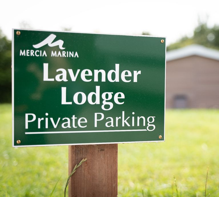 Mercia Marina’s main entrance from B5008. At the traffic lights turn onto Findern Lane. Continue over the railway crossing then take the 2nd left turning to the main entrance of Mercia Marina. Turn left at the mini roundabout past the single storey buildings. Follow the car park to the end, bearing right. Ahead you will see green gates with a barrier. Park up and we will meet you to escort you through the gates to Lavender lodge.
